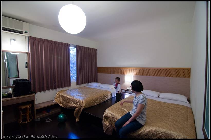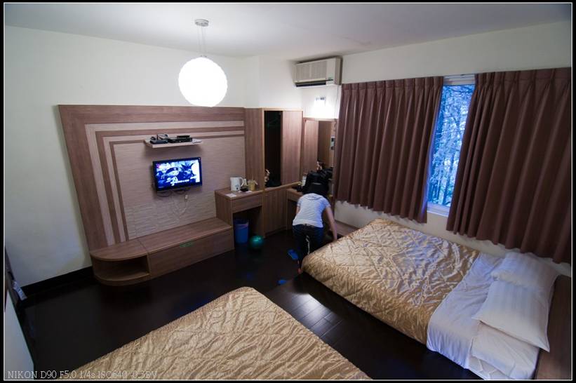 因為是4人房的空間,所以我們一家三口入住是相當寬裕的,只是因為坐落在山中,且連日下雨,房內濕度頗高,幸好屋內有獨立空調,開啟除濕後,濕冷感有稍微下降,而梧桐山莊為100年重新裝潢過,房內設備都很新,電視是使用液晶螢幕且提供MOD,房內可以收到無線訊號,只是有些弱,但還能接受。