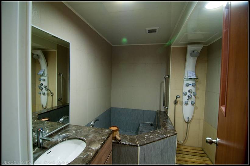 這樣應該可以大概看出這水池有多大了吧,就算兩個大人下去泡也不會覺得窘迫,放水速度也很快,這麼大的水池放到7分滿大約只要10分鐘左右,第一次在知本泡湯,這邊的水質應該是碳酸泉,正常來說應為無臭無味,但是這泉質卻有硫磺味,讓人有點搞不清楚,不過前晚泡完湯後,第二天真的有覺得疲勞感有減少,身體也覺得比較輕鬆些。