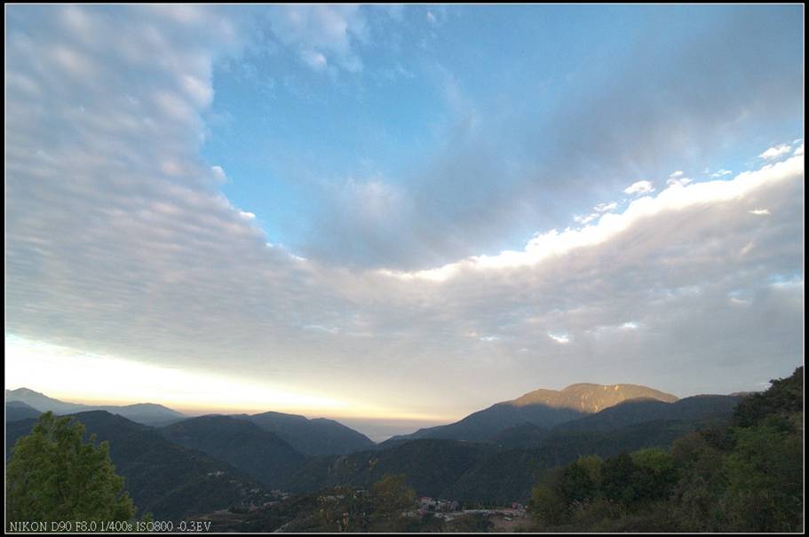六點多的山景,遠方的太陽已漸漸升起,這邊的山頭也緩緩的被陽光照亮著。