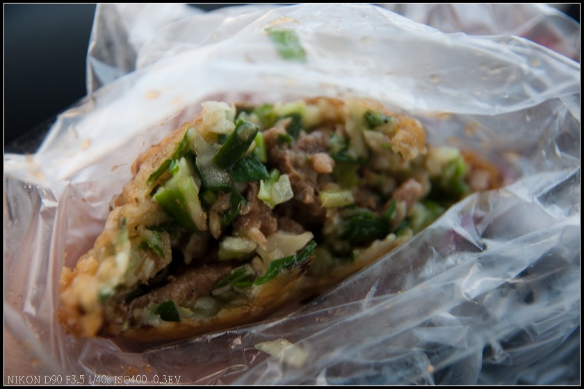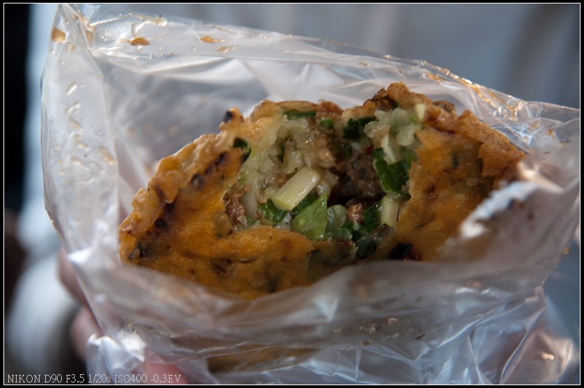 內餡主要有韭菜、高麗菜、青蔥、瘦肉及蚵仔,從斷面也可以看出這蚵嗲外皮很薄,一口咬下可吃到飽滿的內餡,外皮口感薄脆內餡則因不同食材混和帶出豐富的口感,內餡的瘦肉經過醃製,帶些許的鹹味使整體口感不單調,而蚵仔則帶出鮮蚵的香氣及爆醬口感,不過不知道是否為季節的關係,此次吃到的蚵仔都略小,附帶一提食用時務必小心否則很容易被燙到,我就是吃太爽被燙到的例子