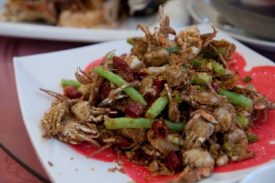 避風塘一口蟹(250元):高溫油炸的小螃蟹與四季豆配上豆酥及辣椒,口感酥脆又不擱口,看起來加了很多辣椒但辣度卻不高,連不吃辣的內人都能接受,配飯吃不錯當下酒菜也很適合。