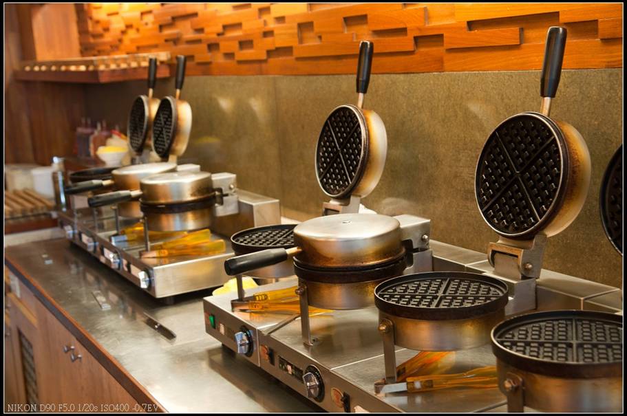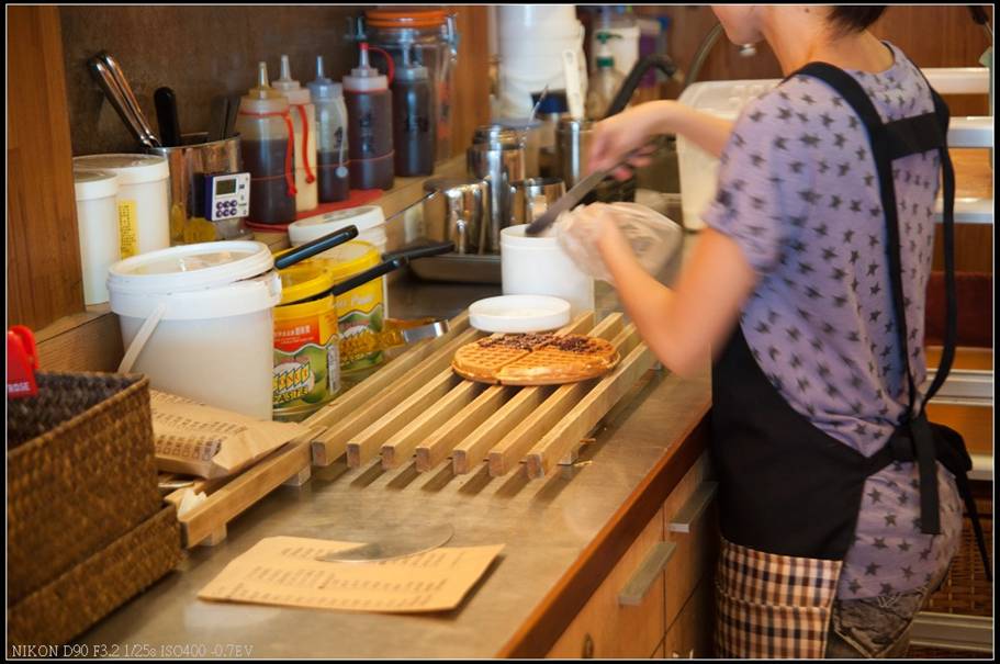 店內有八台鬆餅機,來應付人潮湧現時段,不過我們到達時天氣不算很好,人潮也不多,所以前面只等了一位客人就排到我們。