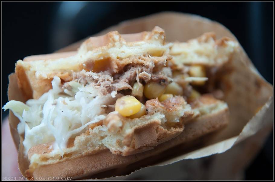 鮪魚玉米鬆餅(45元):除了玉米及鮪魚外還有大量的高麗菜,鮪魚及玉米舖的滿滿的,每一口都能吃到這滿滿的內餡,高麗菜及美乃滋讓這鬆餅帶出不同的滋味及口感,而鬆餅紮實外皮酥脆,鬆餅吃完後紙袋內竟然還有一大坨的鮪魚玉米,只聽過吃燒餅會掉芝麻,沒想到吃鬆餅竟然會掉出一堆鮪魚玉米,店家給的料還真是大方,原本計畫只是想把鬆餅當點心吃,沒想到吃完後飽足感讓我七、八點才想吃晚餐,真是偉哉迪迪